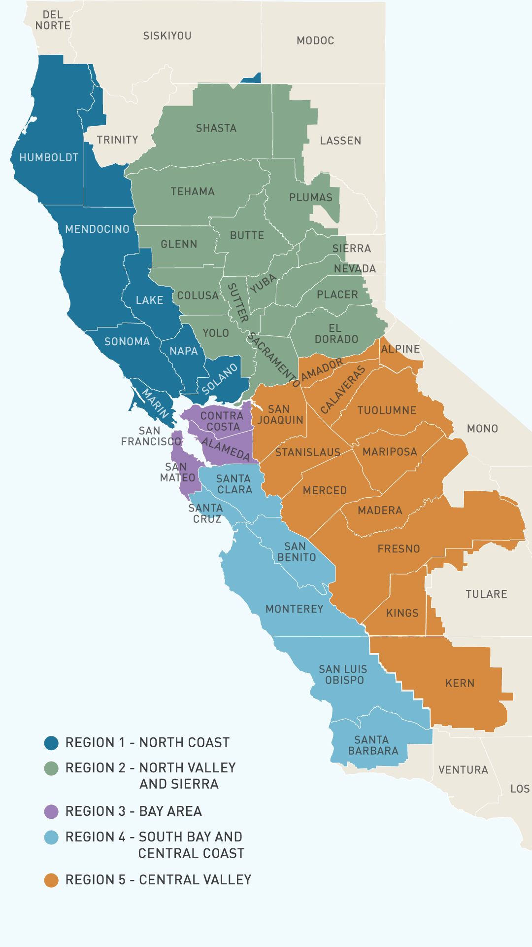 - منطقة الوادي الأوسط: Alpine، Amador، Calaveras، Fresno, Kern، Kings، Madera، Mariposa، Merced، San Joaquin، Stanislaus، Tulare، Tuolumne