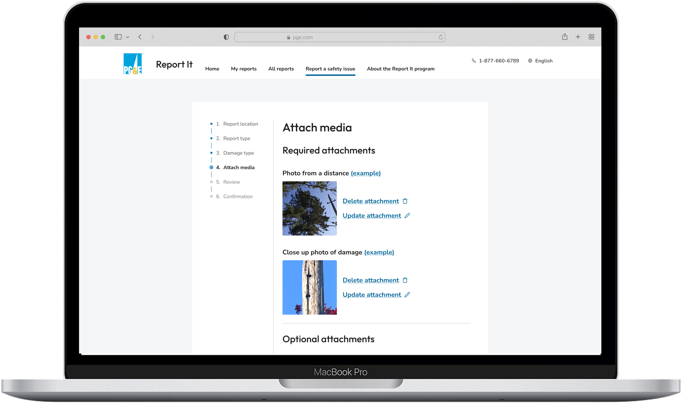 You can also report a safety concern on the Report It web page or by calling PG&E at 1-800-743-5002. You won’t be able to use Report It to view or track the status of the issue if it’s called in.