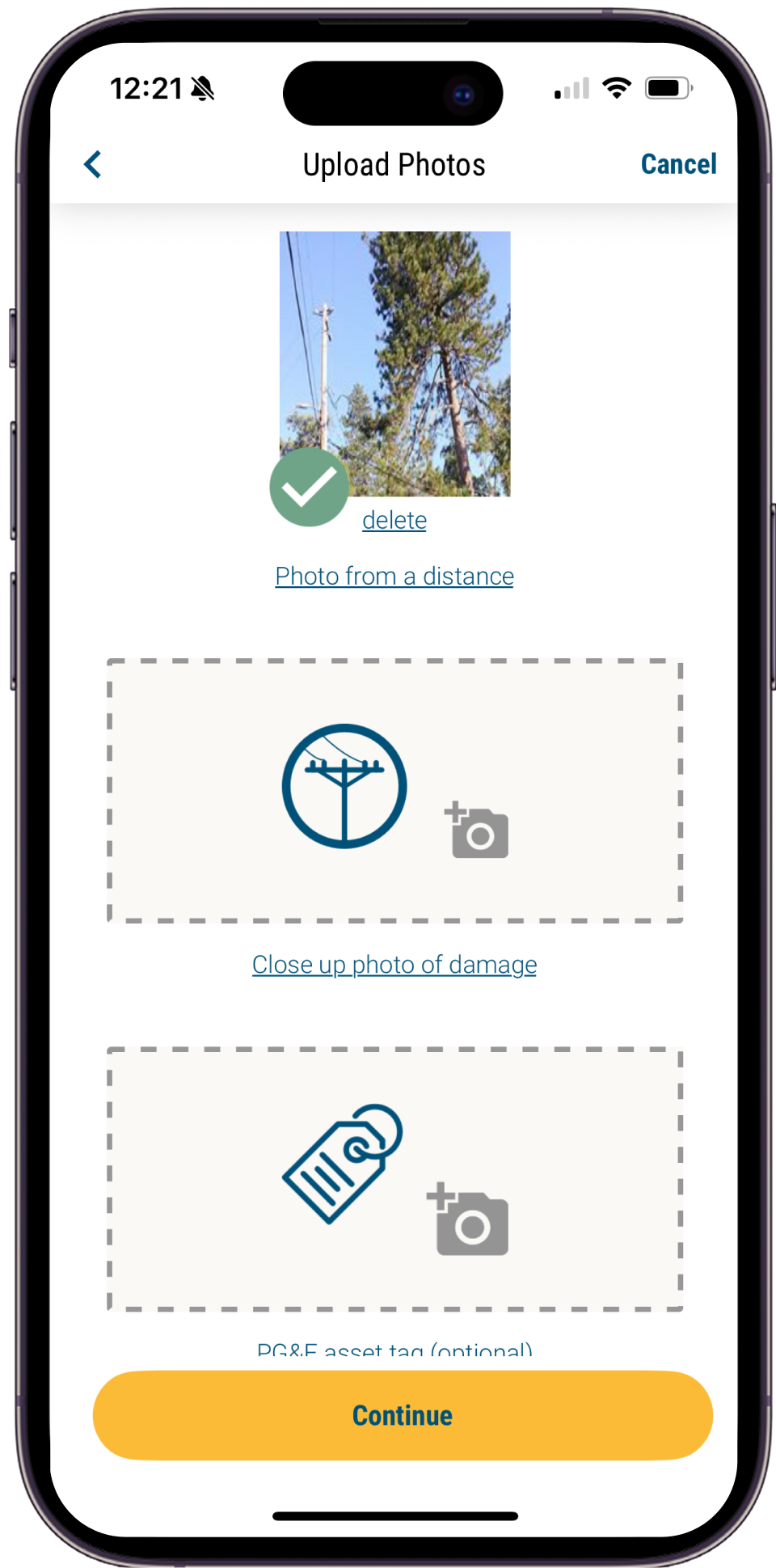 Add up to four photos or a 10-second video of the safety issue. Include one photo of the damage close up and one from far away. If possible, provide a photo of the asset tag number on a nearby power pole. You can select photos and videos you've already taken or use the camera from your phone.