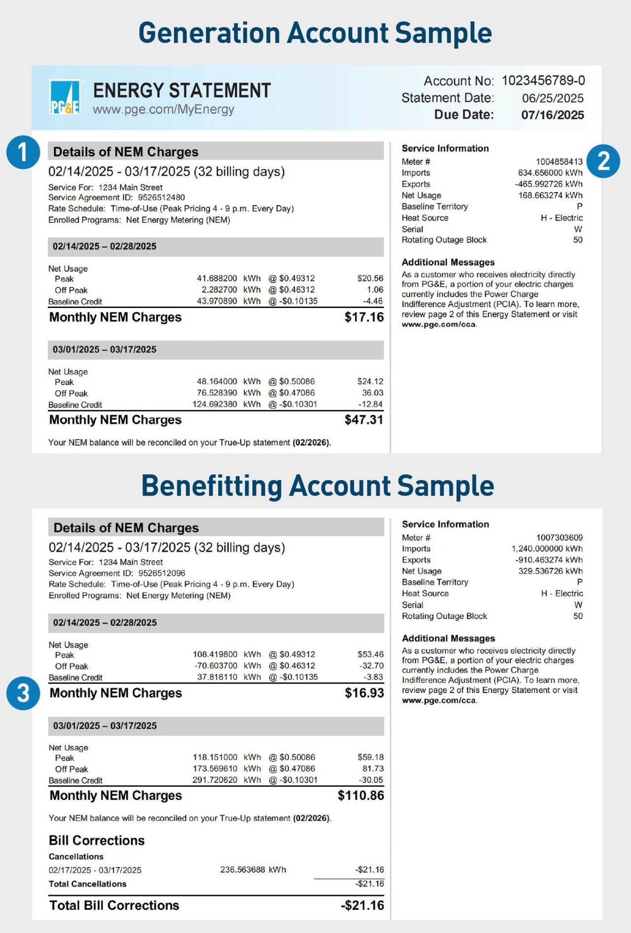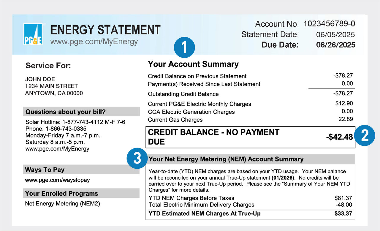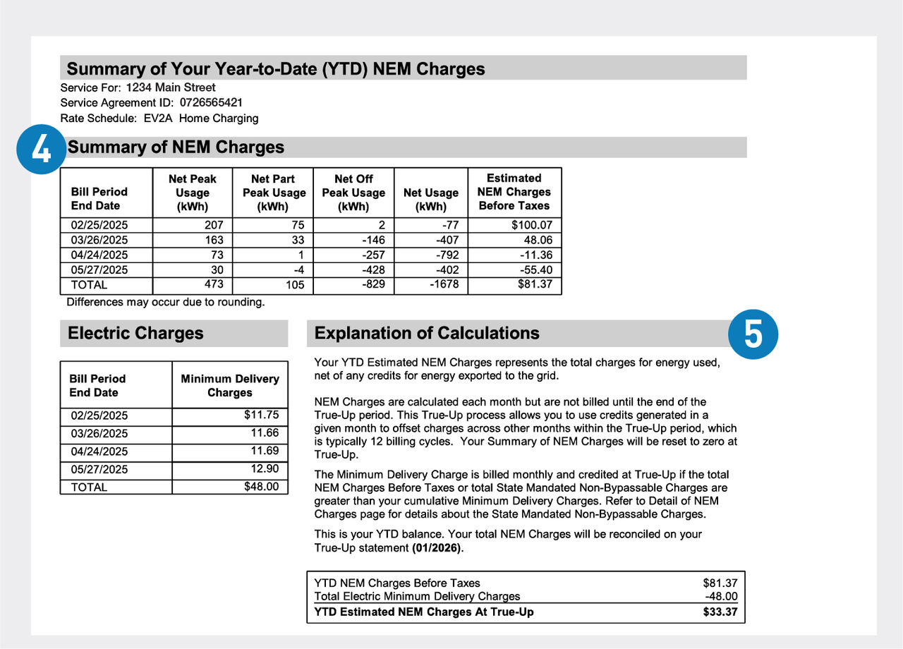 - សេចក្តីសង្ខេបនៃការគិតថ្លៃ NEM របស់អ្នក៖ តារាងសង្ខេបបង្ហាញពីការបង្កើត ឬការប្រើប្រាស់ថាមពលសុទ្ធប្រចាំខែ និងការគិតថ្លៃ ឬឥណទានដែលពាក់ព័ន្ធ។ វាសង្ខេបការគិតថ្លៃ NEM សរុបចាប់ពីការចាប់ផ្តើមនៃរយៈពេល True-Up ប្រចាំឆ្នាំរបស់អ្នក និងផ្តល់នូវទិដ្ឋភាពទូទៅប្រចាំខែនៃការប្រើប្រាស់ថាមពលសុទ្ធរបស់អ្នក។