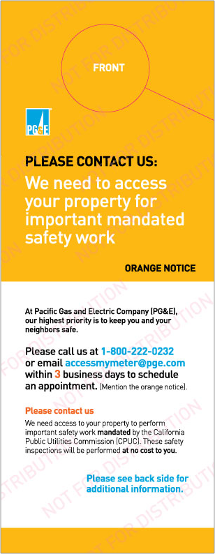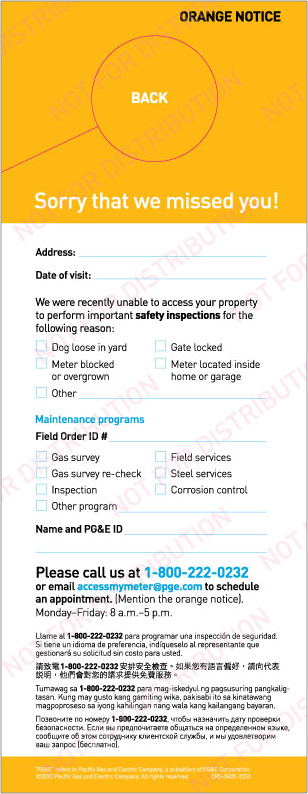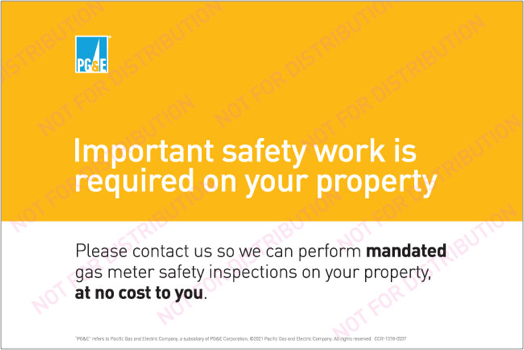 ការត្រួតពិនិត្យសុវត្ថិភាពម៉ែត្រឧស្ម័នត្រូវបានកំណត់ដោយ CPUC ឱ្យកើតឡើងរៀងរាល់ 1-3 ឆ្នាំម្តង។ ដើម្បីបញ្ចប់ការត្រួតពិនិត្យដែលត្រូវការ យើងត្រូវការការចូលទៅកាន់ឧបករណ៍វាស់ឧស្ម័ននៅកន្លែងរបស់អ្នកដោយគ្មានការរាំងស្ទះ។