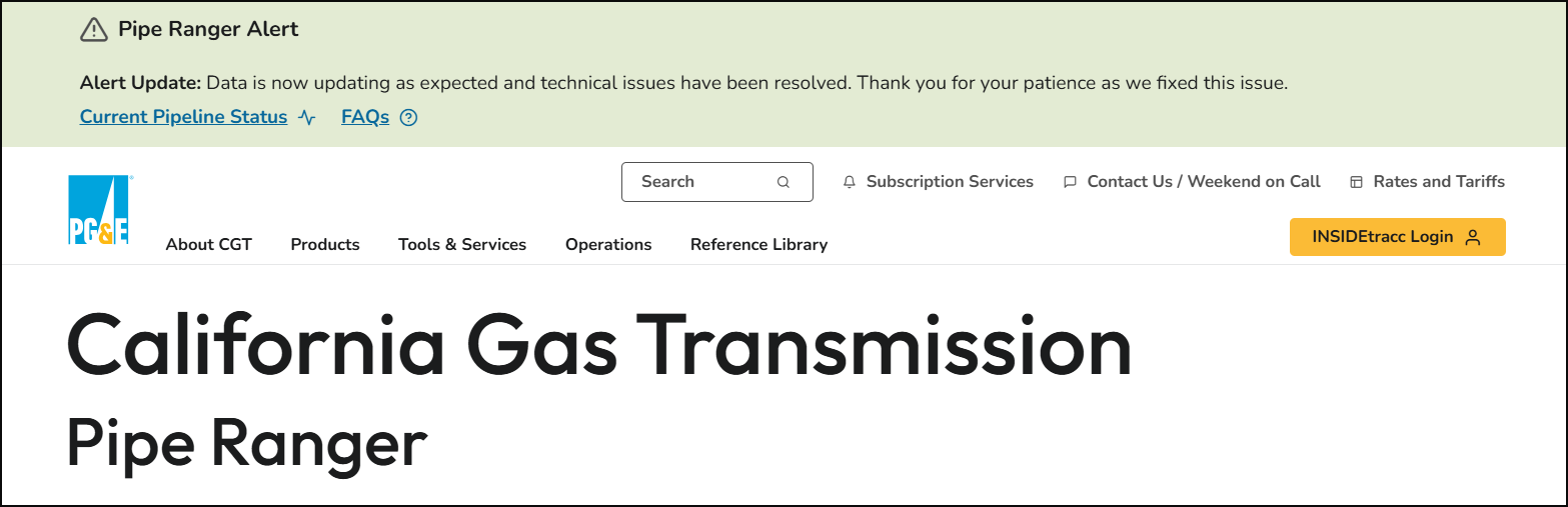 California Gas Transmission is excited to announce a new feature on Pipe Ranger that will enhance your user experience. Introducing the Alert Banner, a new addition to the Pipe Ranger site that will display at the top of the page whenever there are technical issues affecting the site.